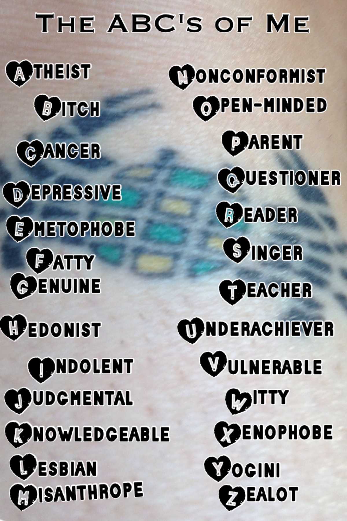 The ABC’s of Me Standard Being the tiniest bit OCD, I’m obsessed with the number 8 and the alphabet. I love putting things in alphabetical order, including, apparently, myself. Despite my love of the alphabet, I think I’ll start with the one that describes me most . . . Share this: Click to share on X (Opens in new window) X Click to share on Facebook (Opens in new window) Facebook Like Loading... Related