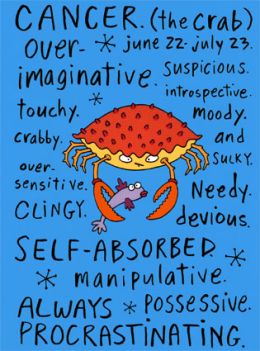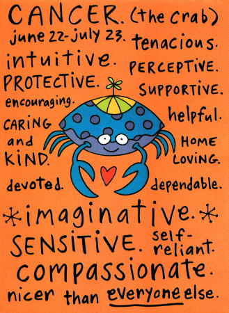 As I mentioned in my Bitch post, the crab that symbolizes Cancer could not be more fitting for me. I have this hard exterior that is difficult to penetrate and claws that hopefully frighten away any potential threats, but these are all defense mechanisms — “the world is a scary place to Cancer planets—they’re emotionally vulnerable, sensitive, and easily hurt.” I’m just trying to keep people from getting to my tender, delicate insides which can be so easily ripped apart and devoured.
